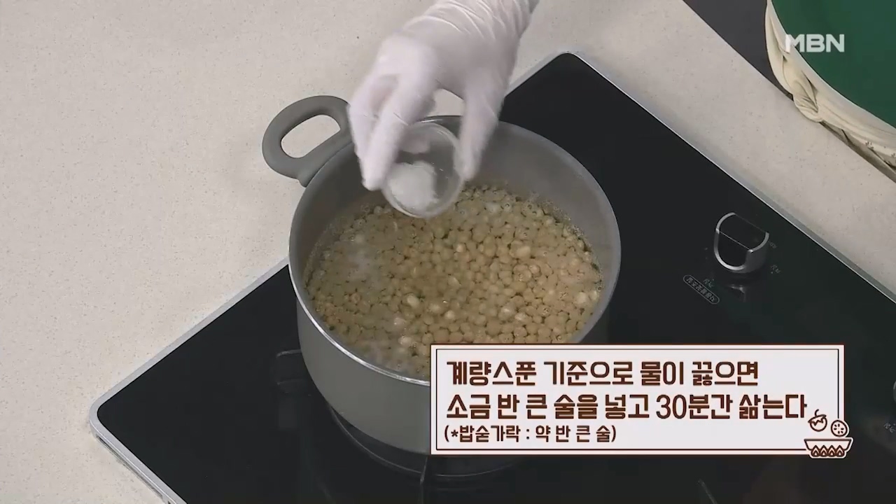 3. 냄비 물이 끓으면 계량스푼 기준으로 소금 반 큰술을 넣고 30분간 삶아줍니다. (밥숟가락 약 반큰술)