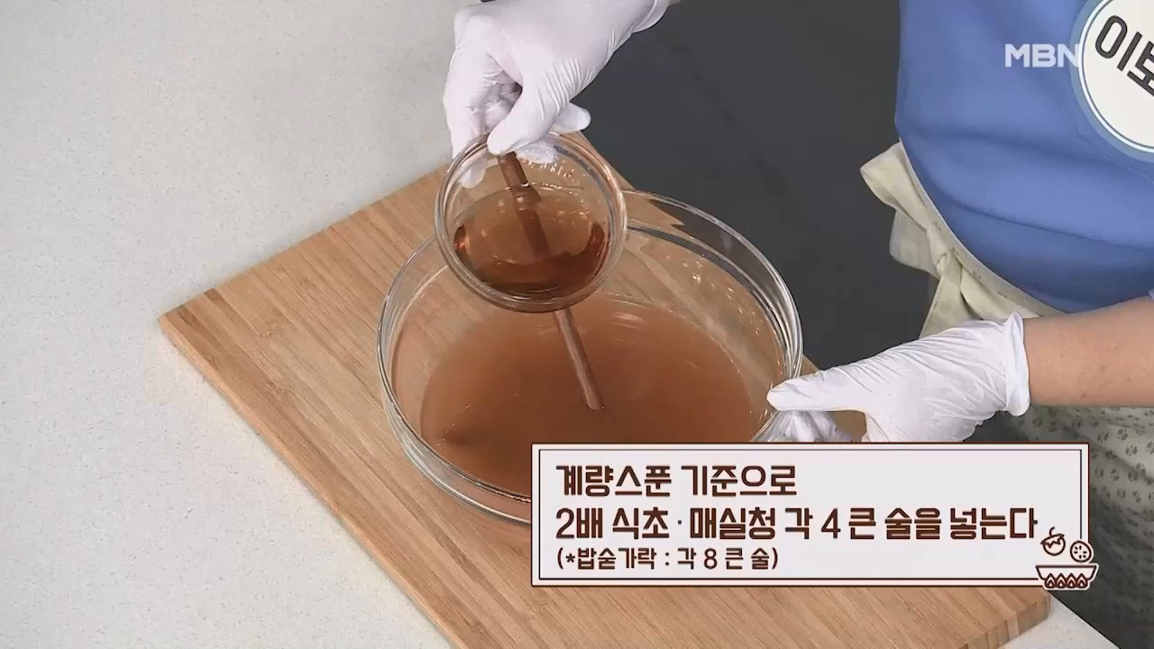 10. 계량스푼 기준으로 2배식초 4큰술, 매실청 4큰술을 넣습니다. (밥숟가락 각 8큰술)