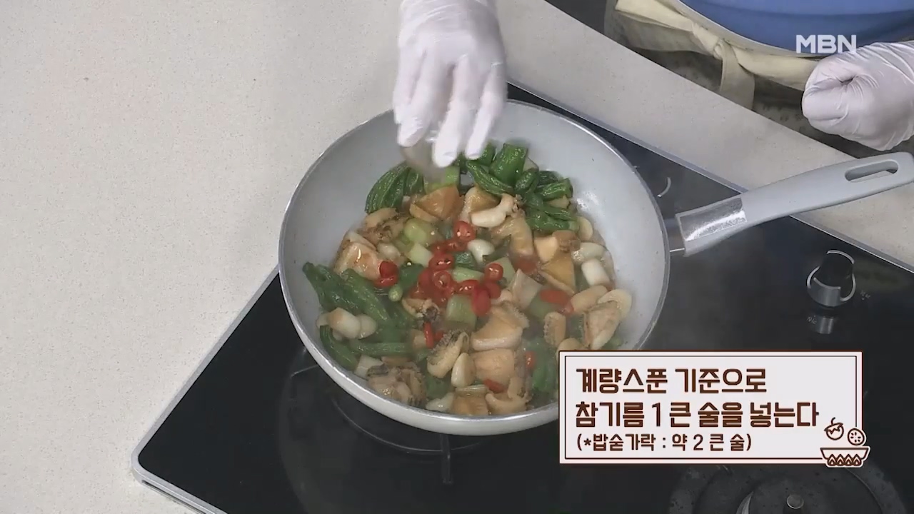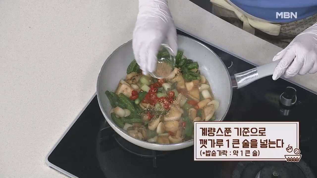 15. 계량스푼 기준으로 깻가루 1큰술을 넣으면 전복꽈리고추조림이 완성됩니다. (밥숟가락 약 1큰술)