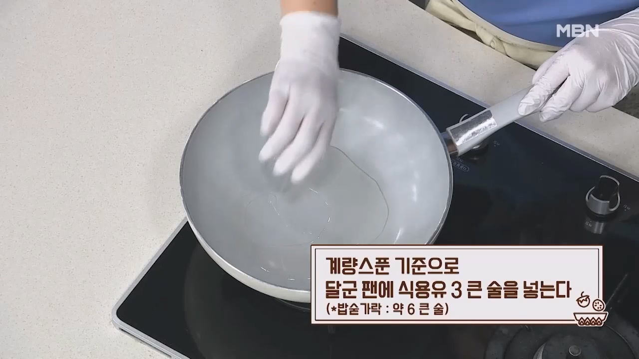4. 계량스푼 기준으로 달군 팬에 식용유 3큰술을 넣습니다. (밥숟가락 약 6큰술)