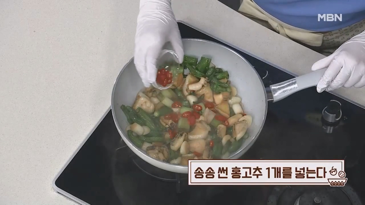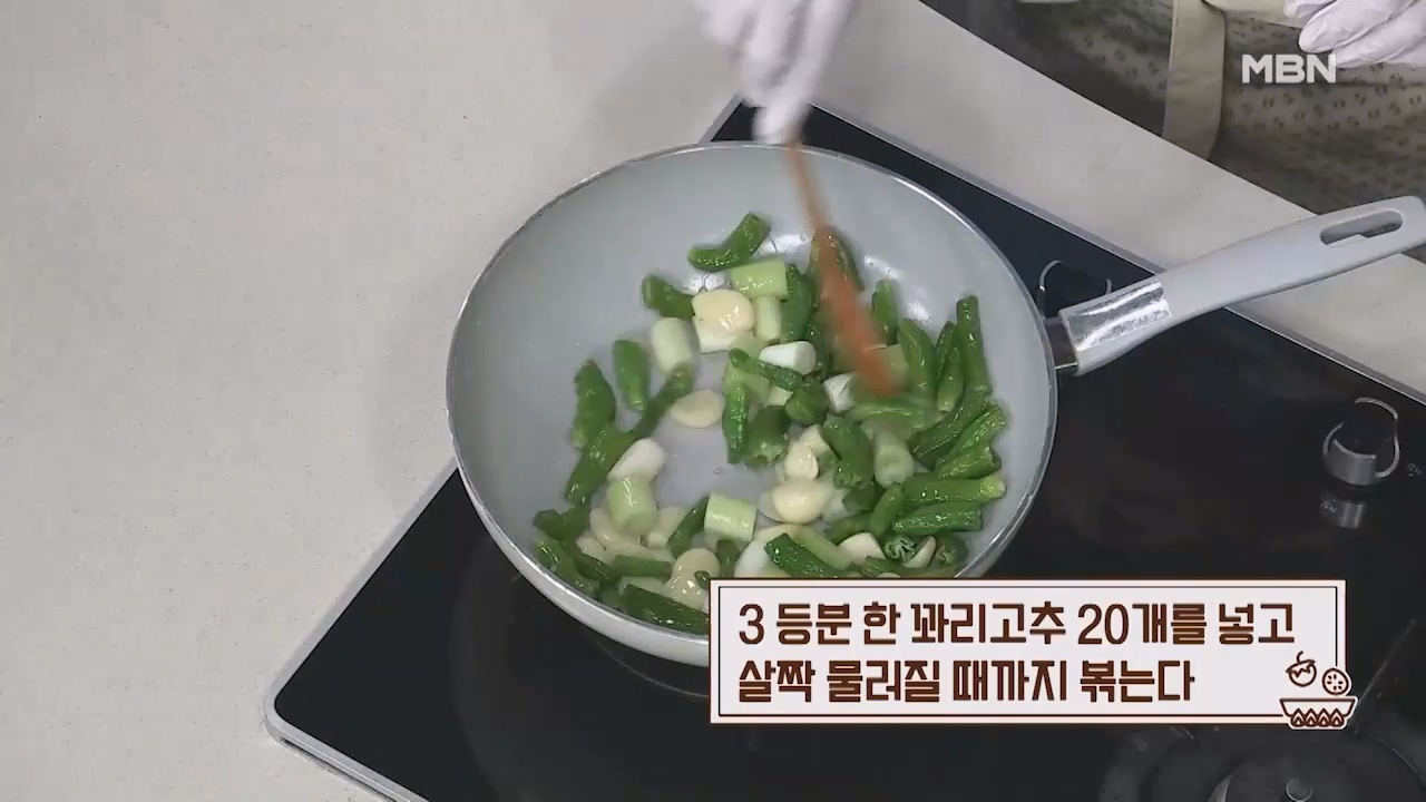 7. 3등분 한 꽈리고추 20개를 넣고 살짝 물러질때까지 볶아줍니다.