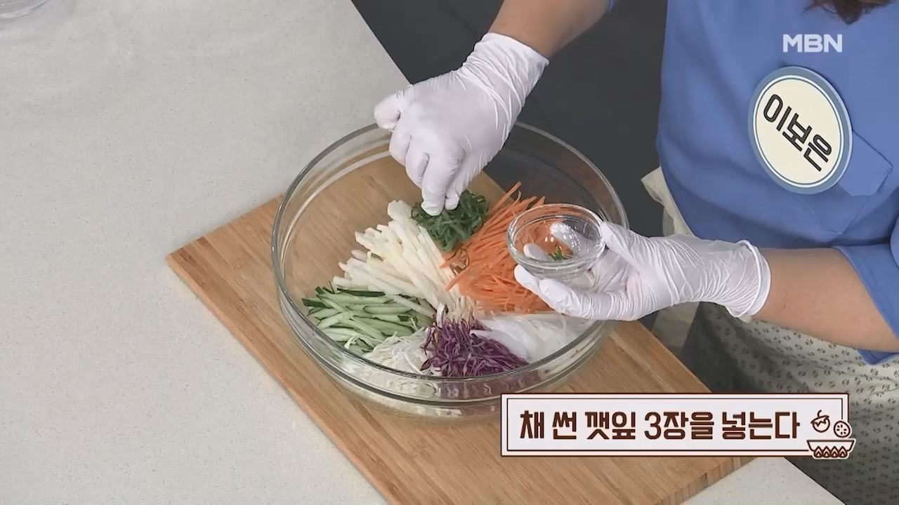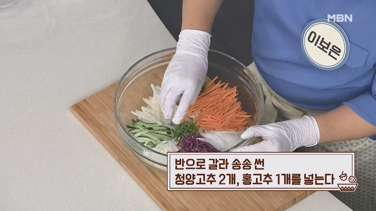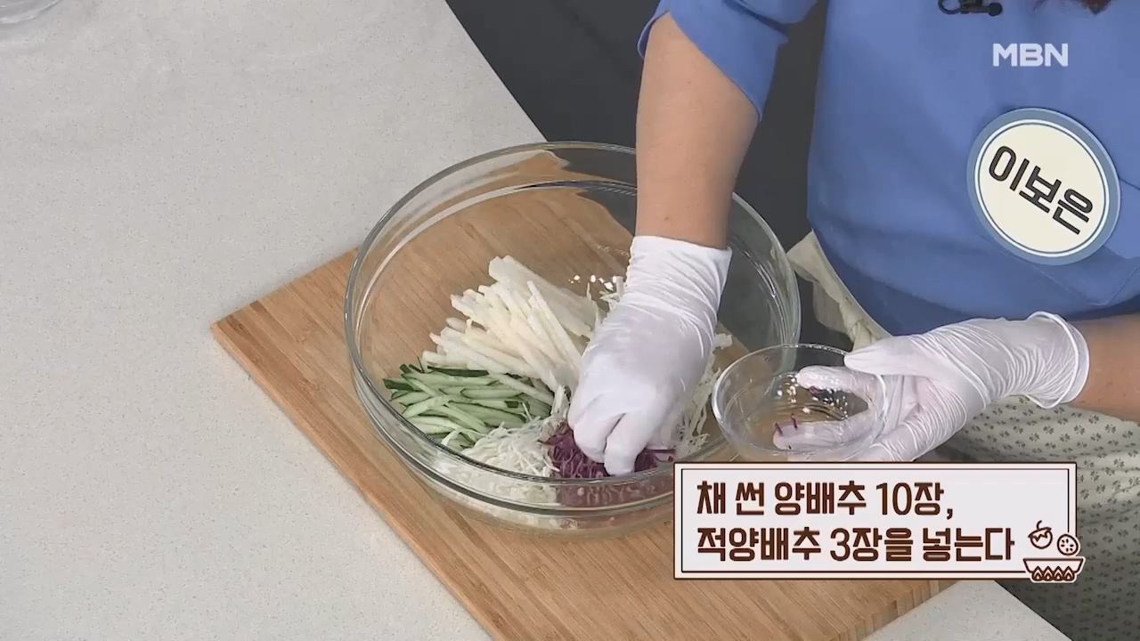 2. 채 썬 양배추 10장, 적양배추 3장을 넣습니다.