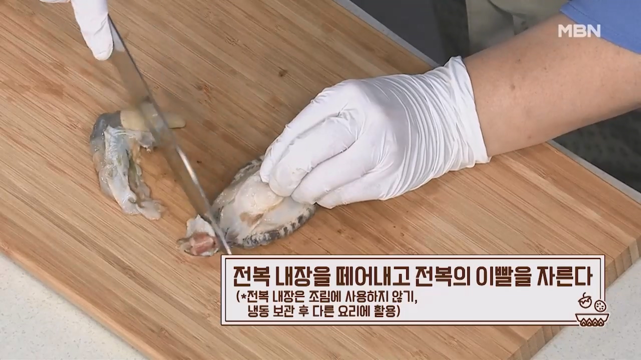 2. 전복 내장을 떼어내고 전복의 이빨을 잘라줍니다. (전복 내장은 조림에 사용하지 않고 냉동 보관후 다른 요리에 활용하면 좋습니다.)