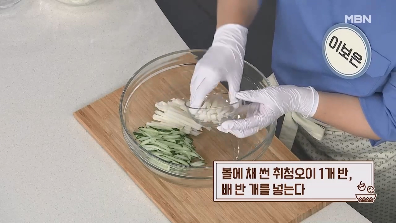 1. 볼에 채 썬 취청오이 1개반, 배 반개를 넣습니다.