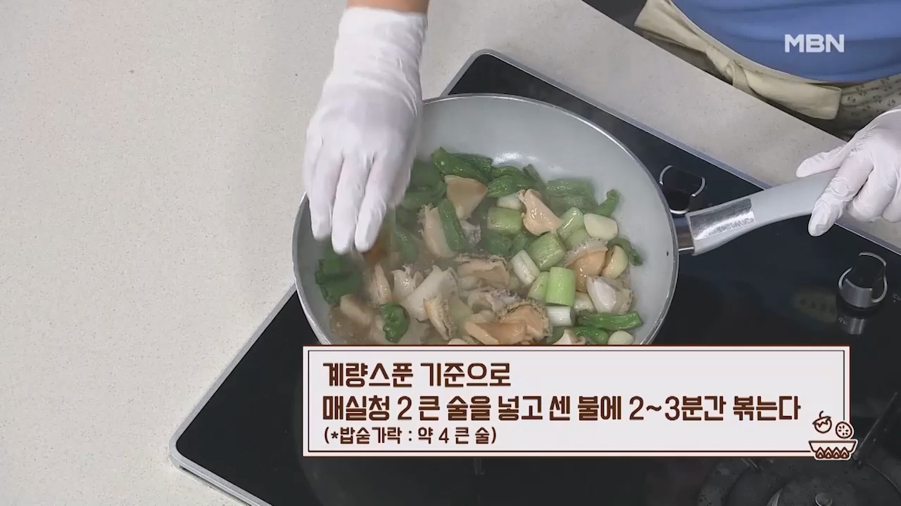 12. 계량스푼 기준으로 매실청 2큰술을 넣고 센불에 2~3분간 볶아줍니다. (밥숟가락 약 4큰술)