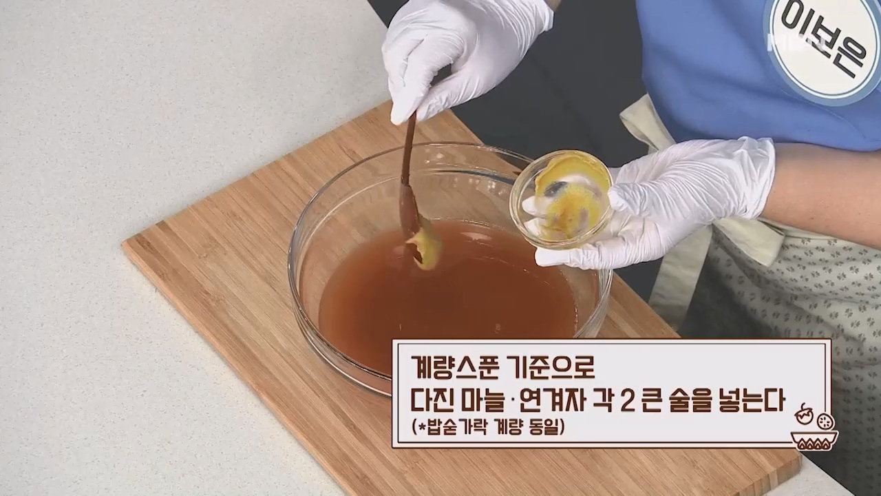 12. 계량스푼 기준으로 다진 마늘 2큰술, 연겨자 2큰술을 넣어줍니다. (밥숟가락 계량 동일)