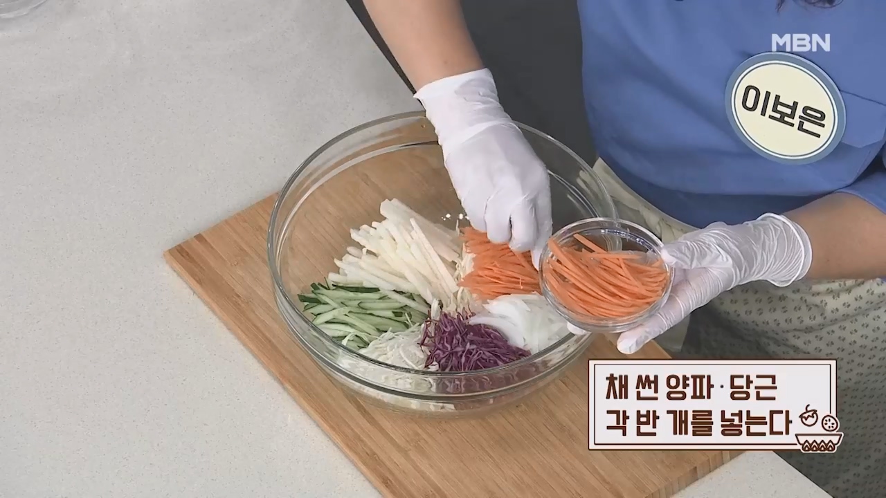 3. 채 썬 양파 반개, 채 썬 당근 반개를 넣습니다.