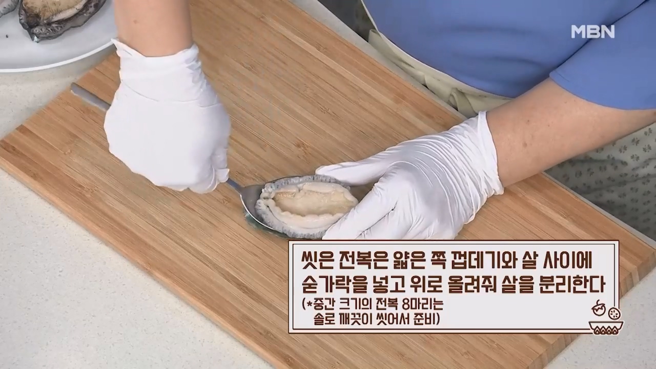 1. 씻은 전복은 얇은 쪽 껍데기와 살 사이에 숟가락을 넣고 위로 올려서 전복살을 분리합니다. (중간 크기의 전복 8마리를 솔로 깨끗이 씻어서 사용합니다.)