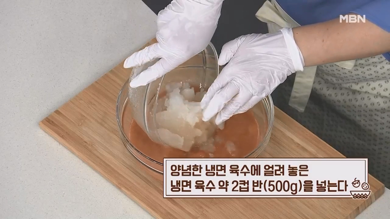 15. 볼에 양념한 냉면육수와 얼려놓은 냉면육수 약 2컵반(500g)을 넣습니다.