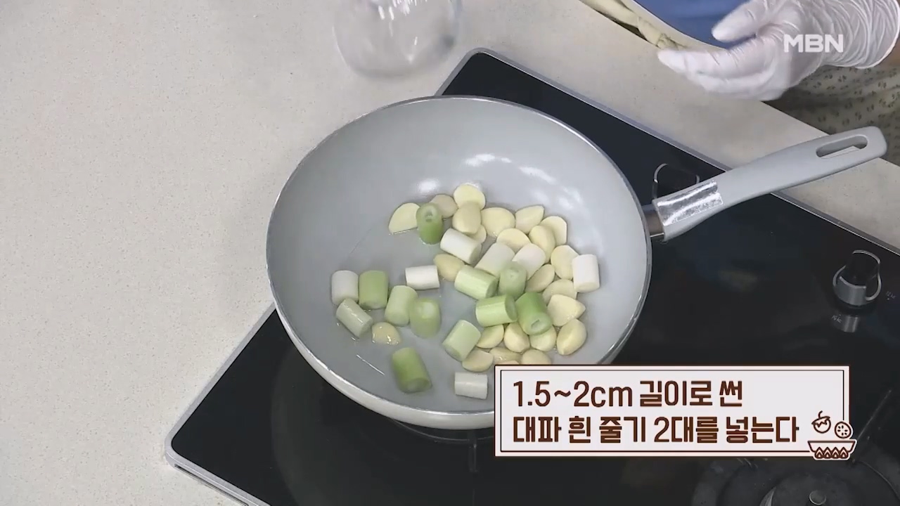 6. 1.5~2cm 길이로 썬 대파 흰줄기 2대를 넣습니다.