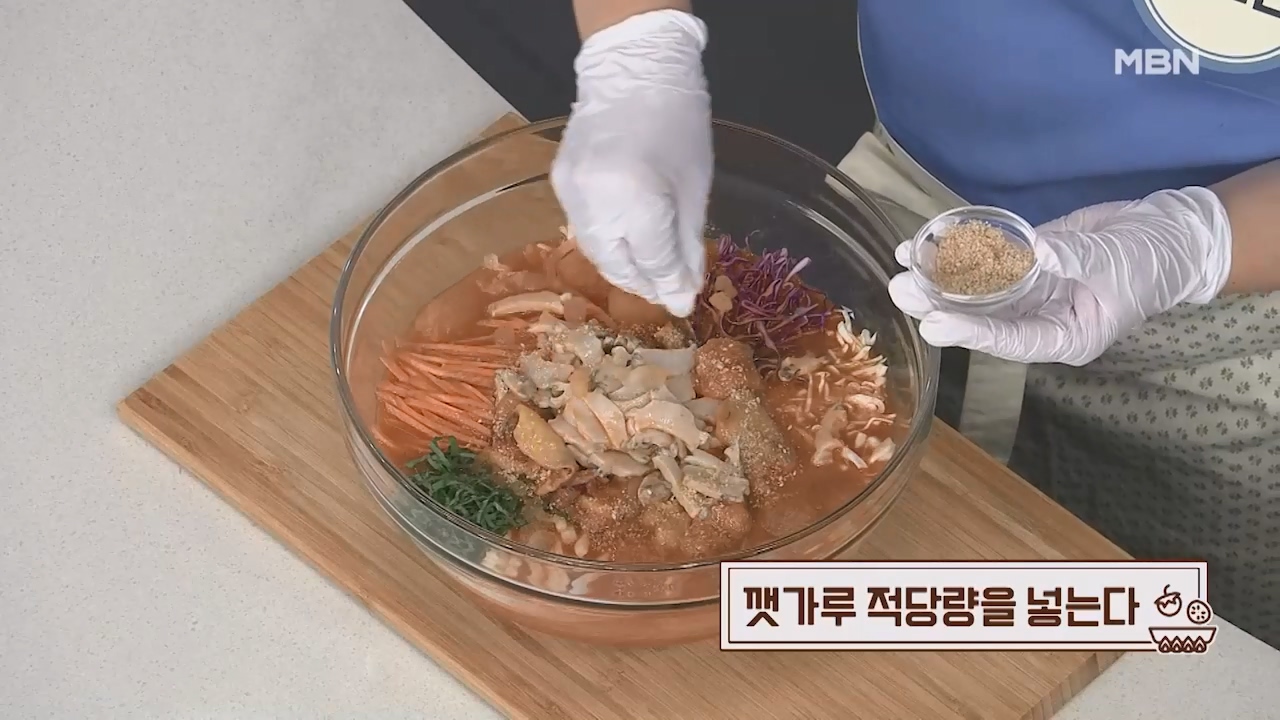 17. 깻가루를 적당량 뿌려주면 전복물회가 완성됩니다.