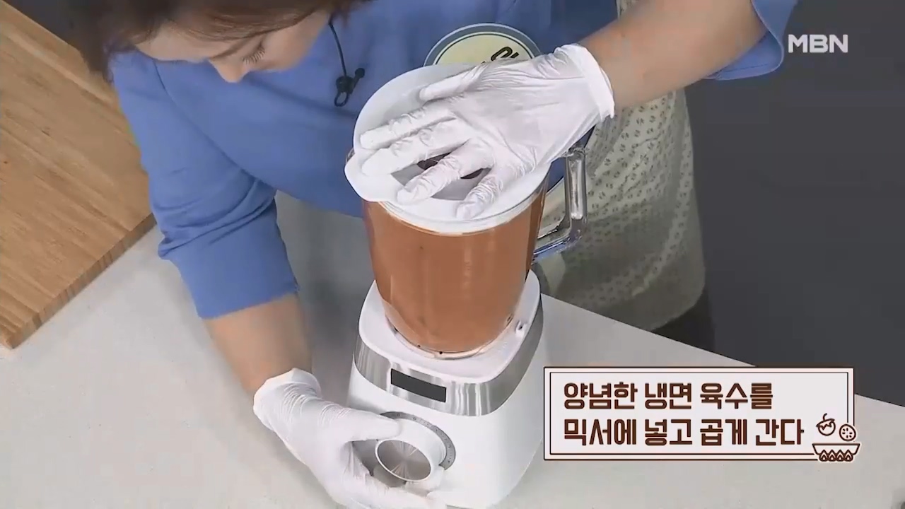 14. 양념한 냉면육수를 믹서에 넣고 곱게 갈아줍니다.