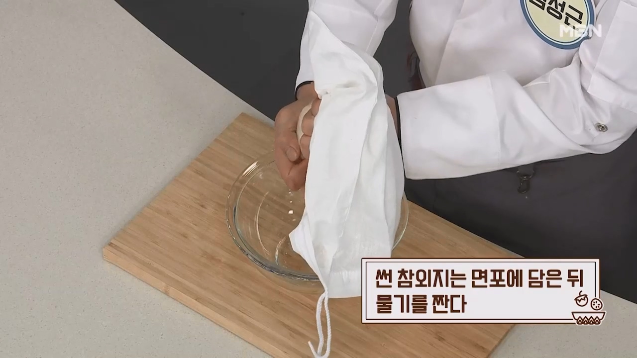 2. 썬 참외지는 면포에 담은 후 물기를 짜줍니다.