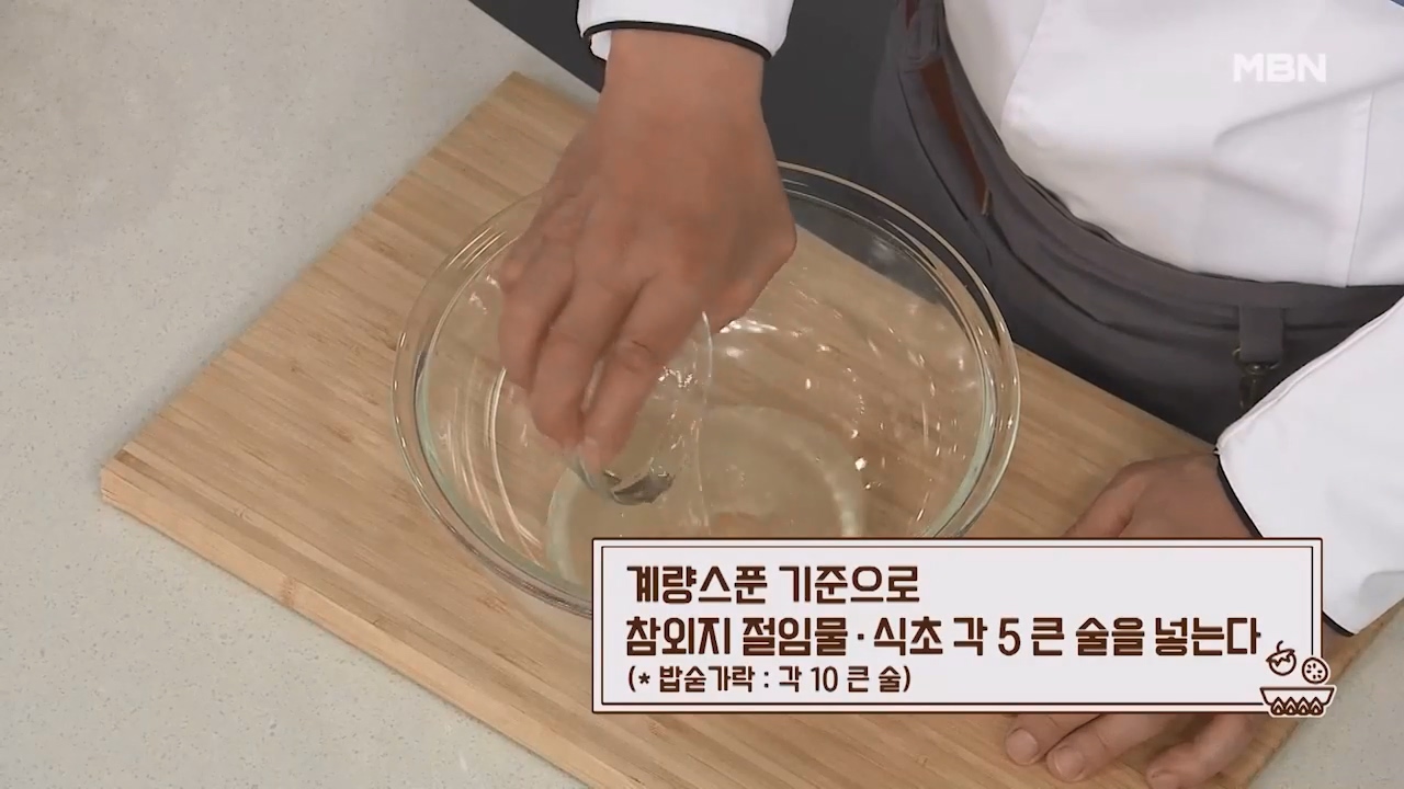 1. 계량스푼 기준으로 참외지 절임물 5큰술, 식초 5큰술을 넣습니다. (밥숟가락 각 10큰술)