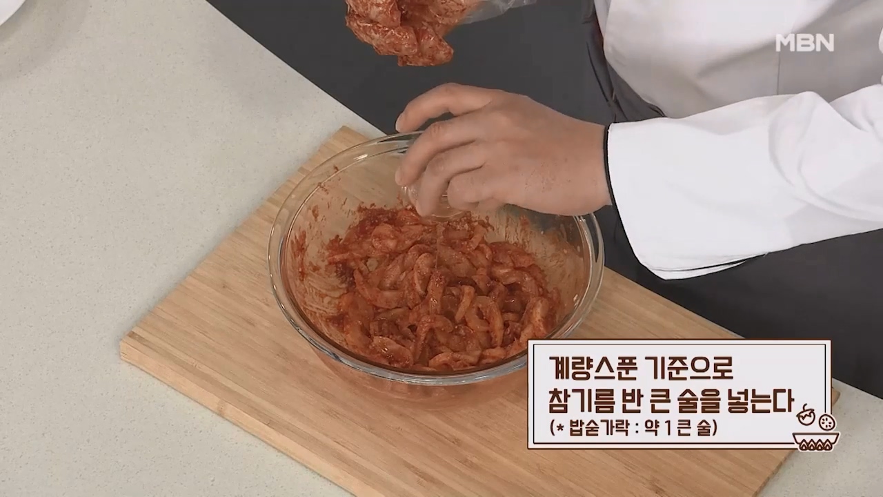 7. 계량스푼 기준으로 참기름 반큰술을 넣습니다. (밥숟가락 약 1큰술)