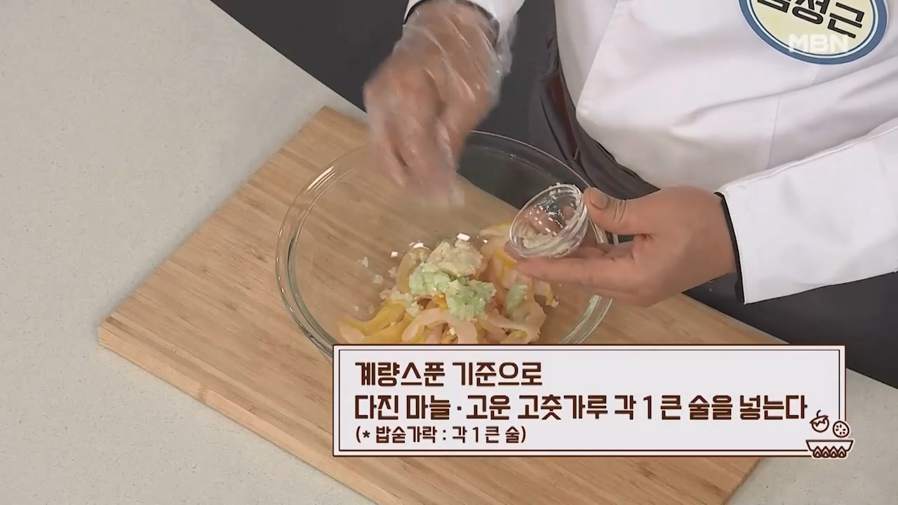 4. 계량스푼 기준으로 다진마늘 1큰술, 고운 고춧가루 1큰술을 넣습니다.