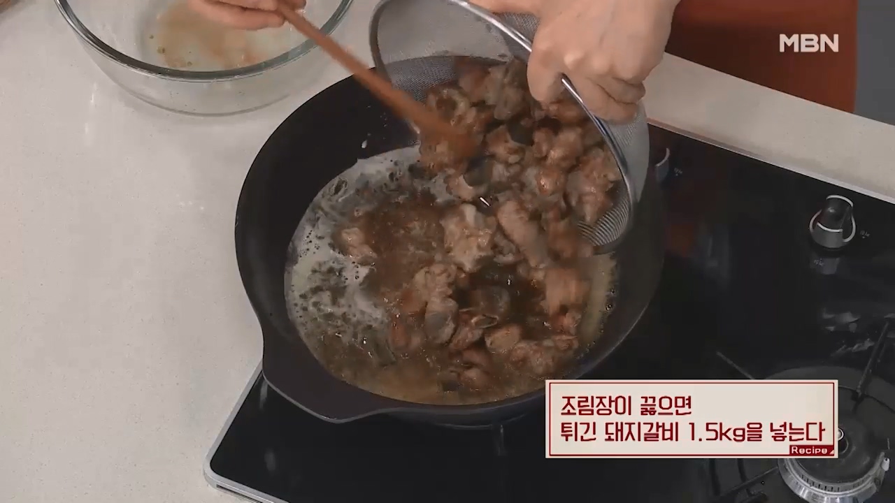 7. 조림장이 끓으면 튀긴 돼지갈비 1.5kg을 넣습니다.