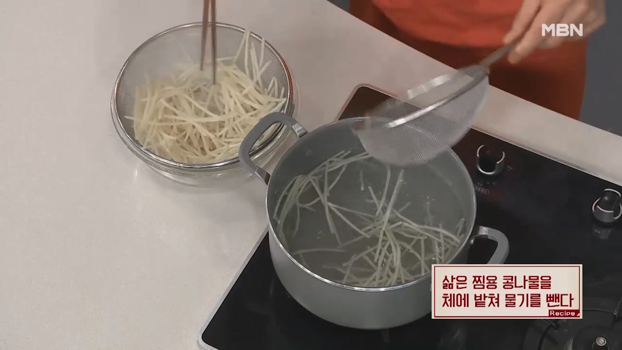 2. 삶은 찜용 콩나물을 체에 밭쳐 물기를 제거합니다.