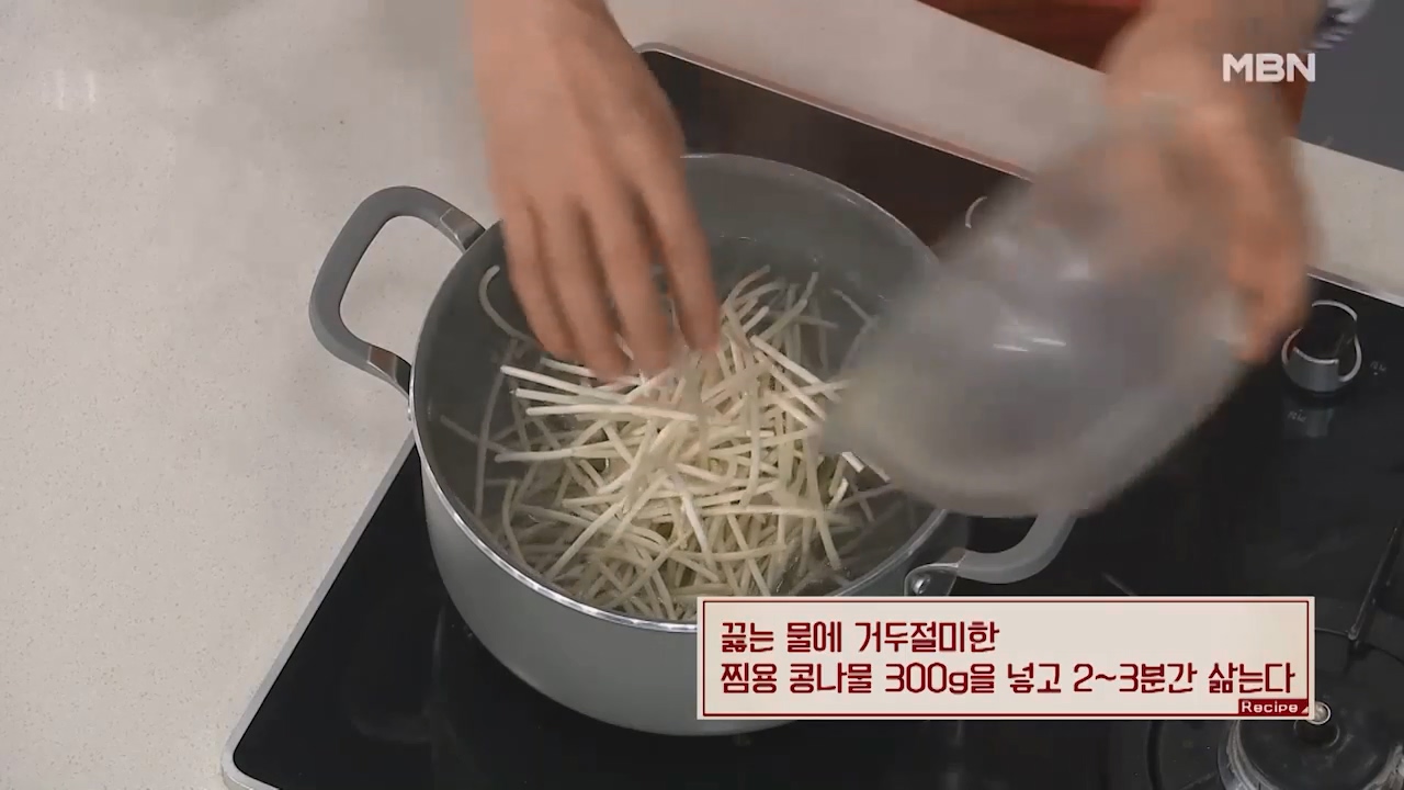 1. 끓는 물에 거두절미한 찜용 콩나물 300g을 넣고 2~3분간 삶아줍니다.