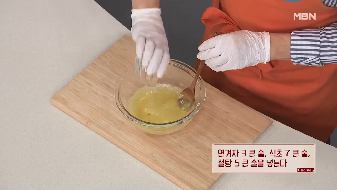 5. 연겨자 3큰술, 식초 7큰술, 설탕 5큰술을 넣습니다.