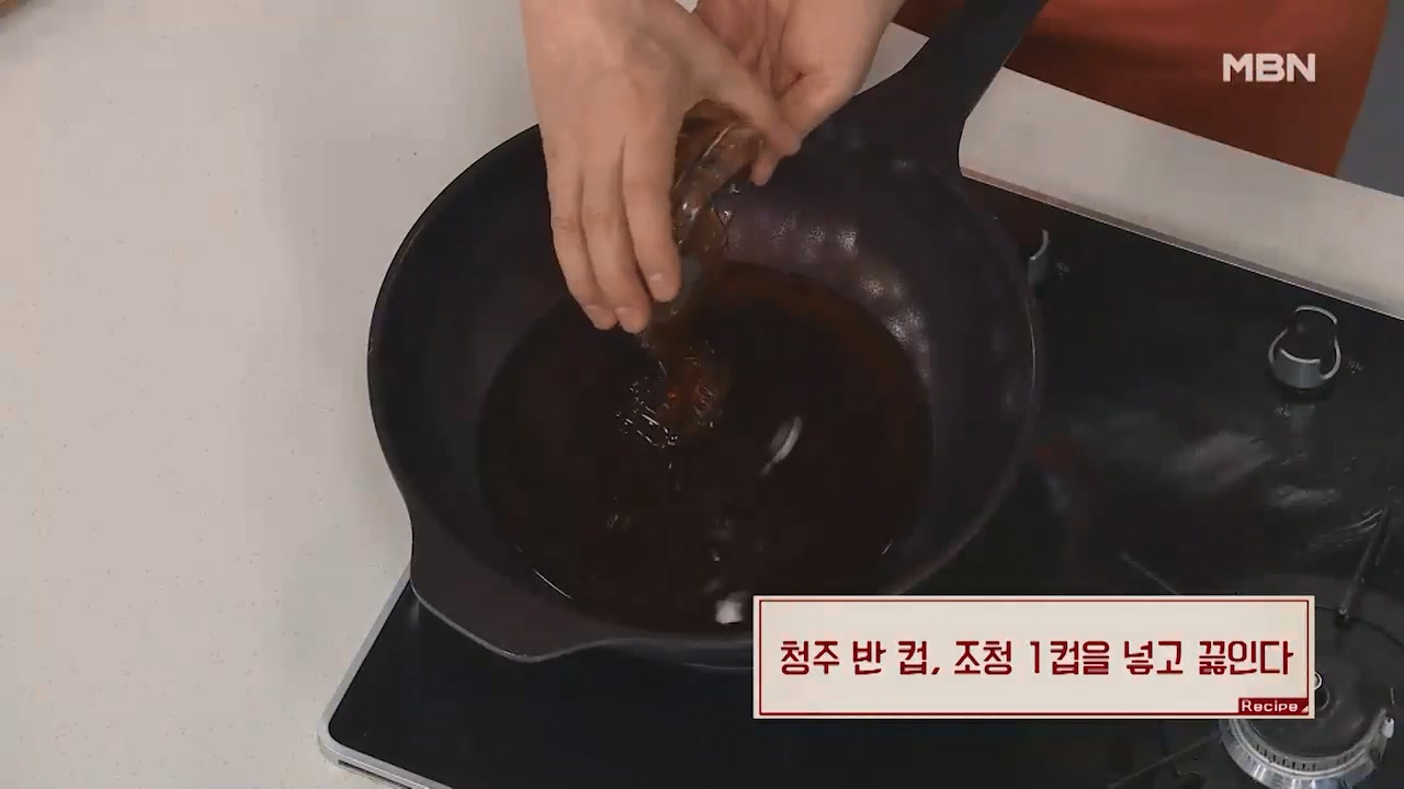 5. 팬에 간장 3큰술, 맛술 2컵을 넣습니다.