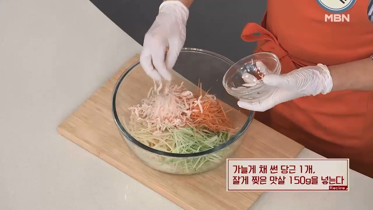 4. 가늘게 채 썬 당근 1개, 잘게 찢은 맛살 150g을 넣습니다.
