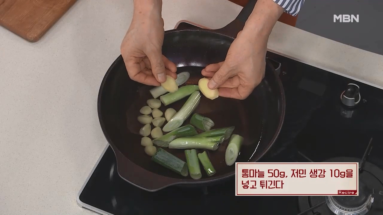 2. 통마늘 50g, 저민 생강 10g을 넣고 튀깁니다.