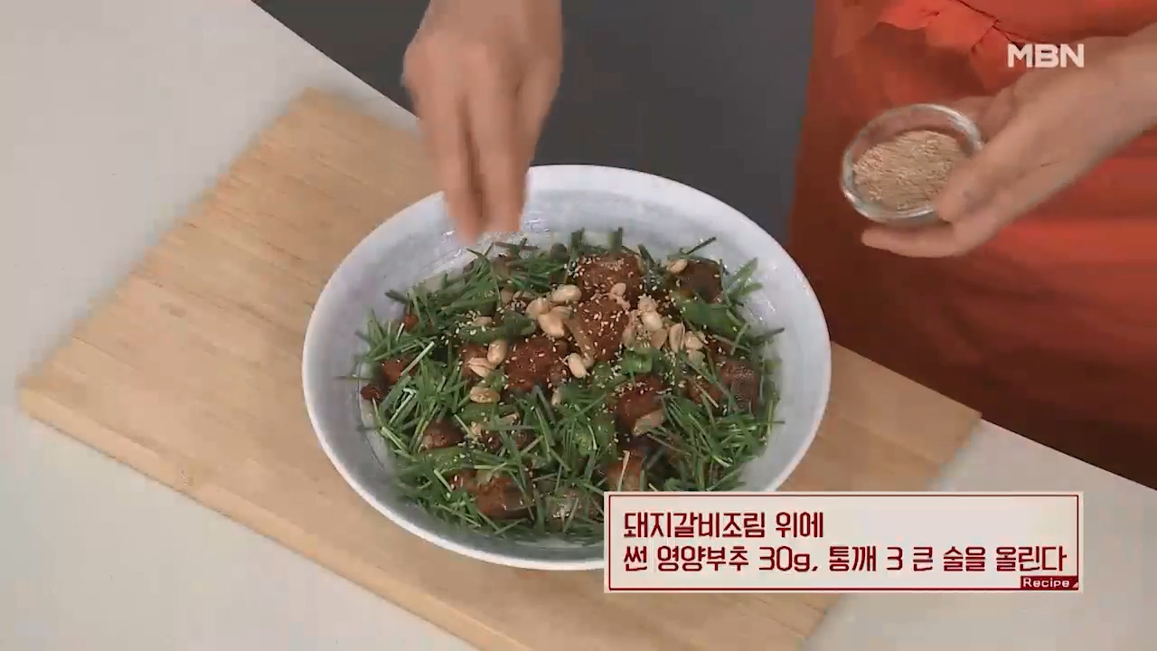 9. 돼지갈비조림위에 썬 영양부추 30g, 통깨 3큰술을 올리면 됩니다.