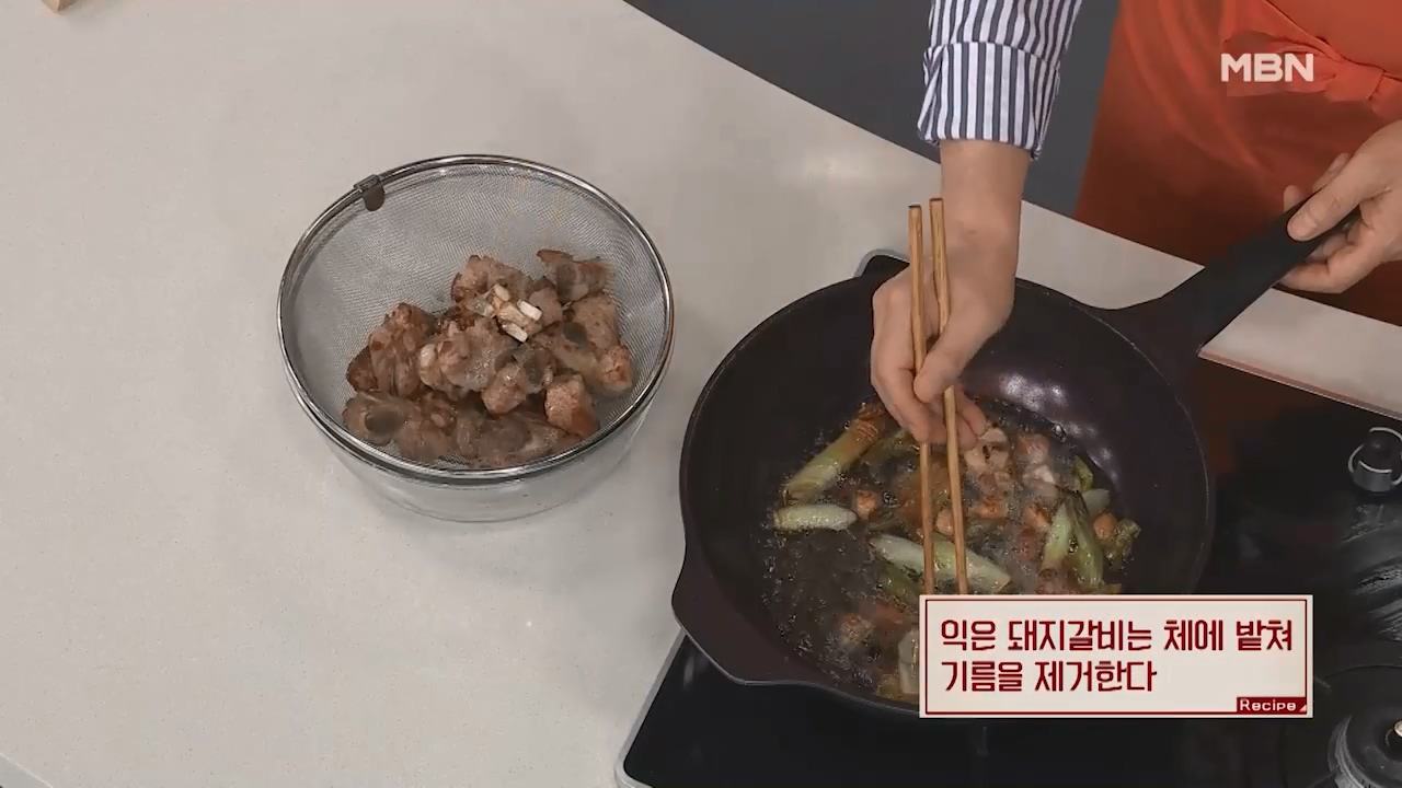 4. 익은 돼지갈비는 체에 밭쳐 기름을 제거합니다.