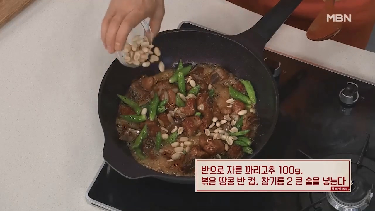 8. 반으로 자른 꽈리고추 100g, 볶은 땅콩 반컵, 참기름 2큰술을 넣습니다.