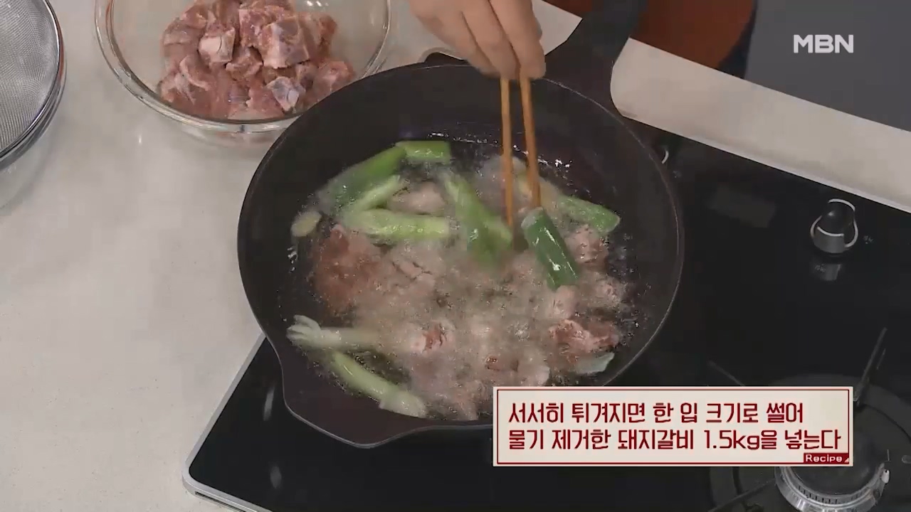 3. 서서히 튀겨지면 한입 크기로 썰어 물기 제거한 돼지갈비 1.5kg을 넣습니다.