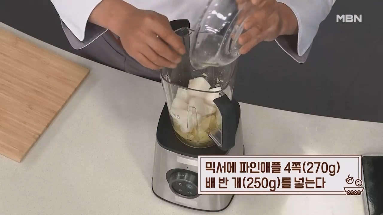 7. 믹서기에 파인애플 4쪽(270g), 배 반개 (250g)를 넣습니다.