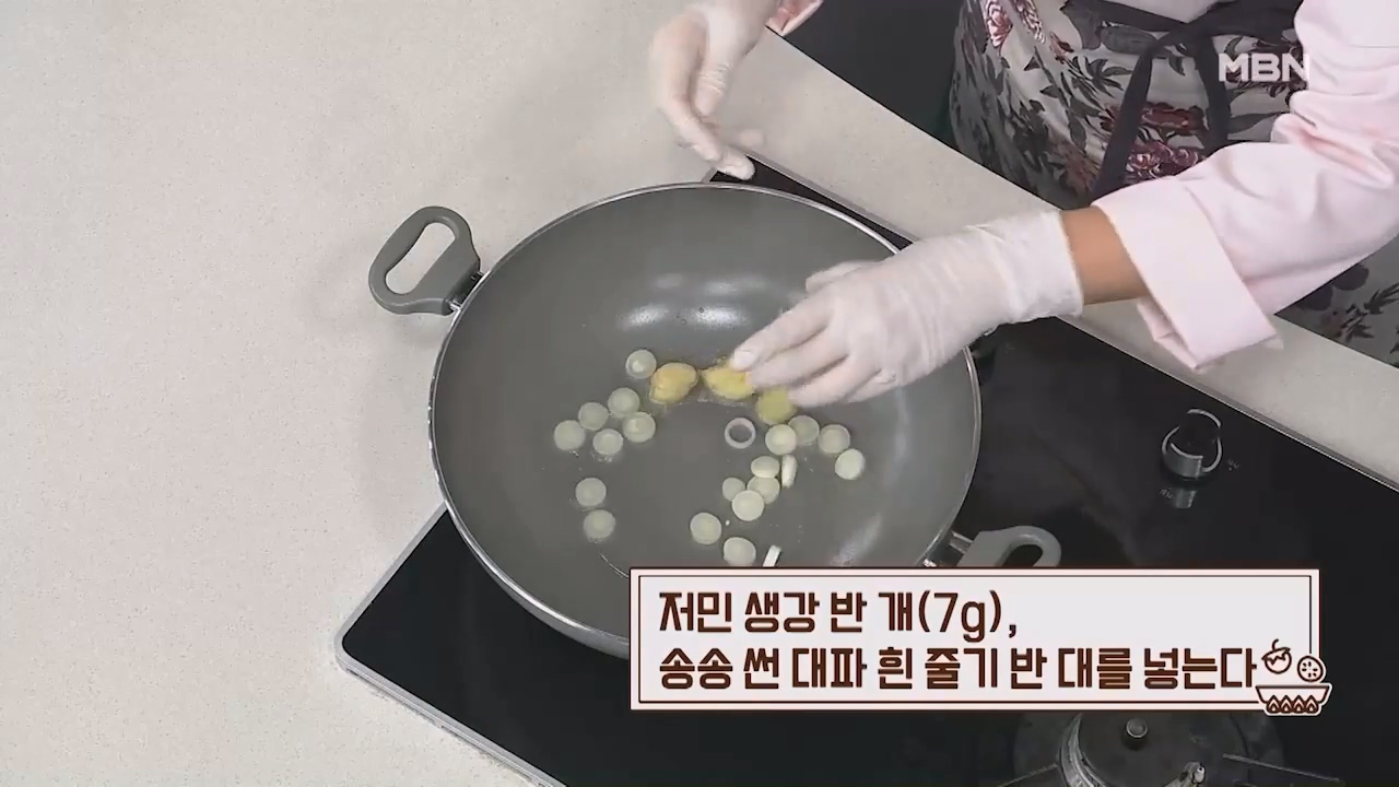 19. 저민 생강 반개 (7g), 송송 썬 대파 흰줄기 반대를 넣습니다.