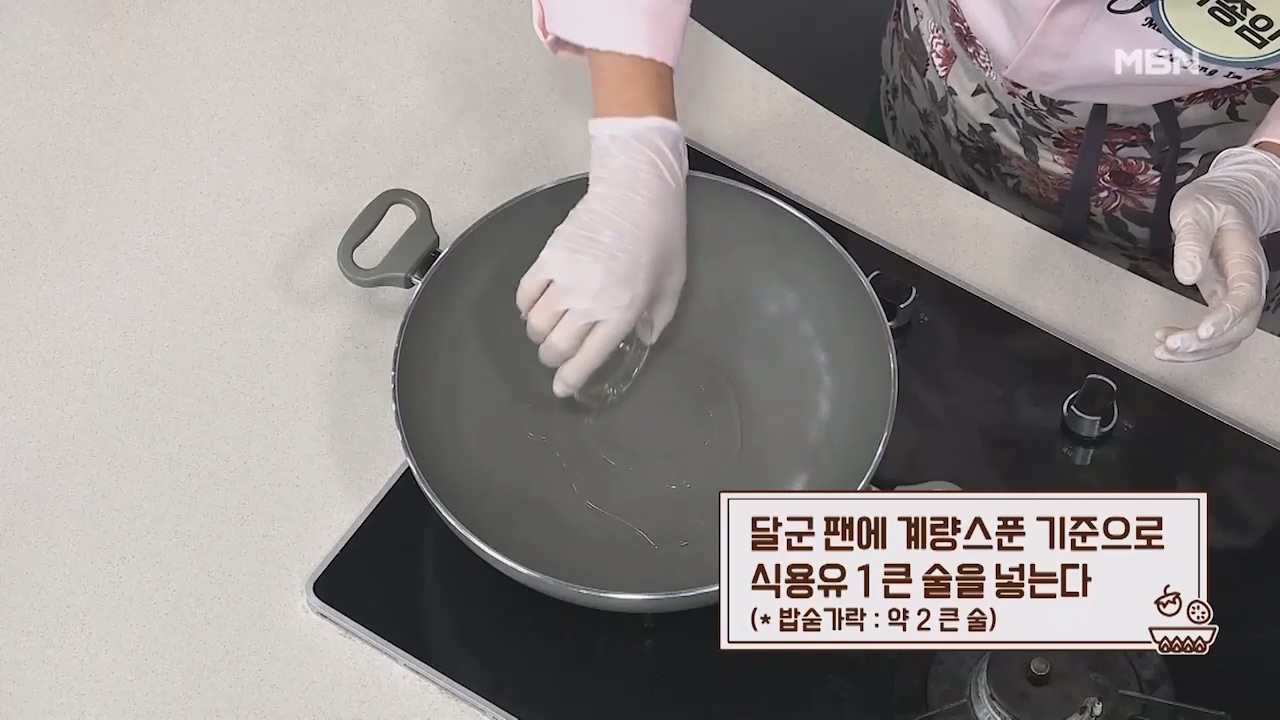 18. 달군 팬에 계량스푼 기준으로 식요유 1큰술을 넣습니다. (밥숟가락 약 2큰술)