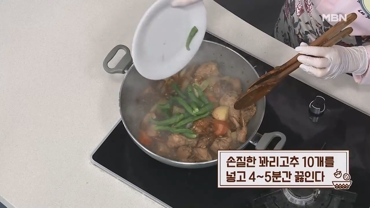 26. 손질한 꽈리고추 10개를 넣고 4~5분간 끓이면 맛있는 찜닭이 완성됩니다.