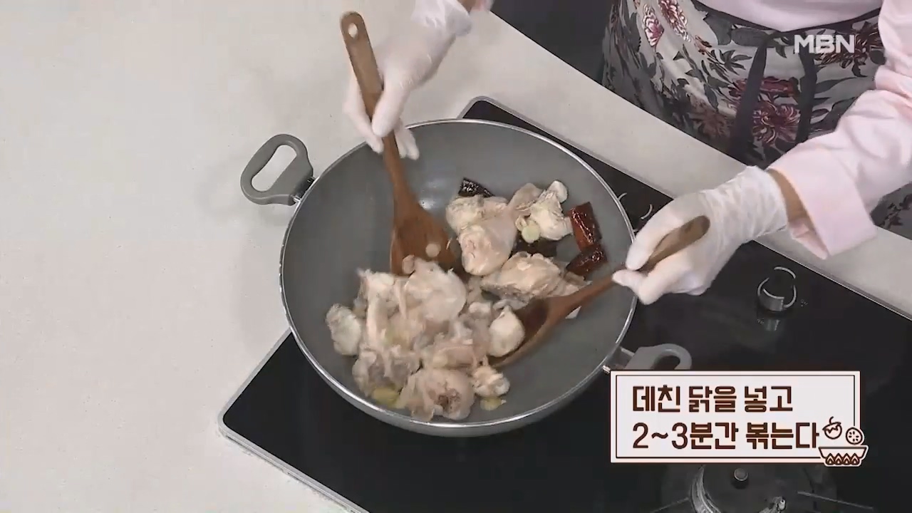 21. 데친 닭을 넣고 2~3분간 볶아줍니다.