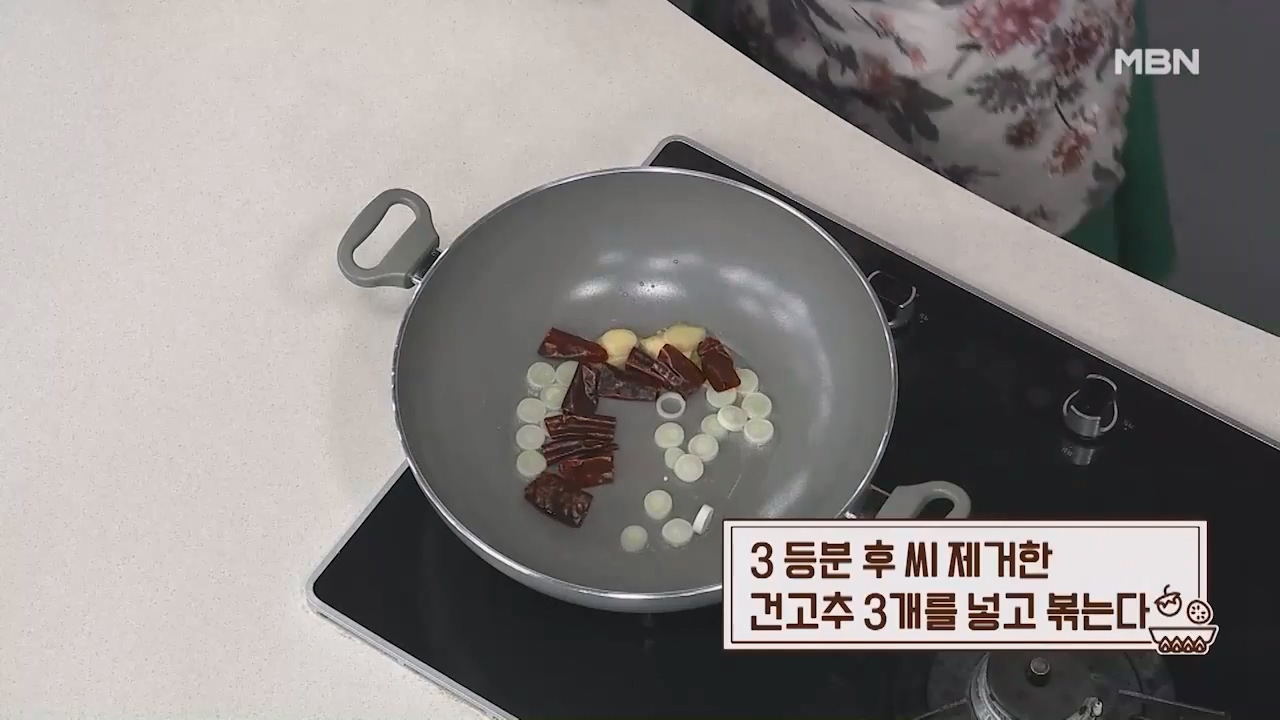 20. 3등분 후 씨 제거한 건고추 3개를 넣고 볶아줍니다.