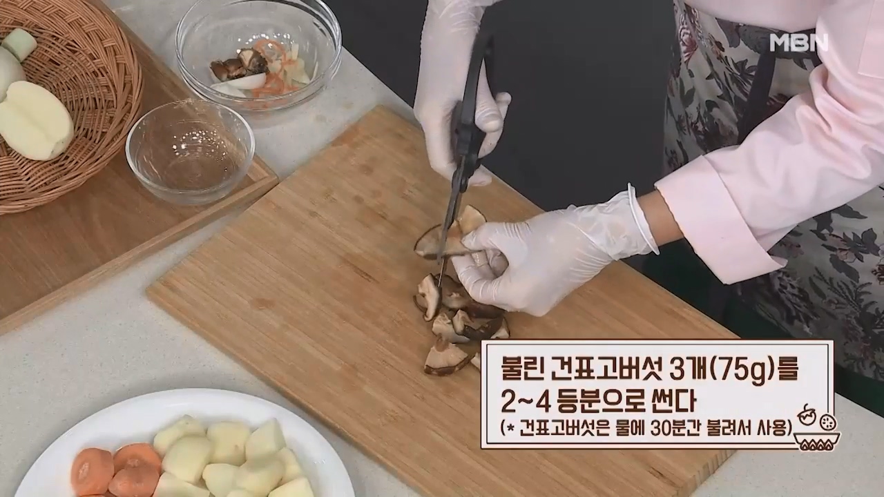 9. 불린 건표고버섯 3개(75g)를 2~4등분으로 썰어줍니다. (건표고버섯은 물에 30분간 불려서 사용)