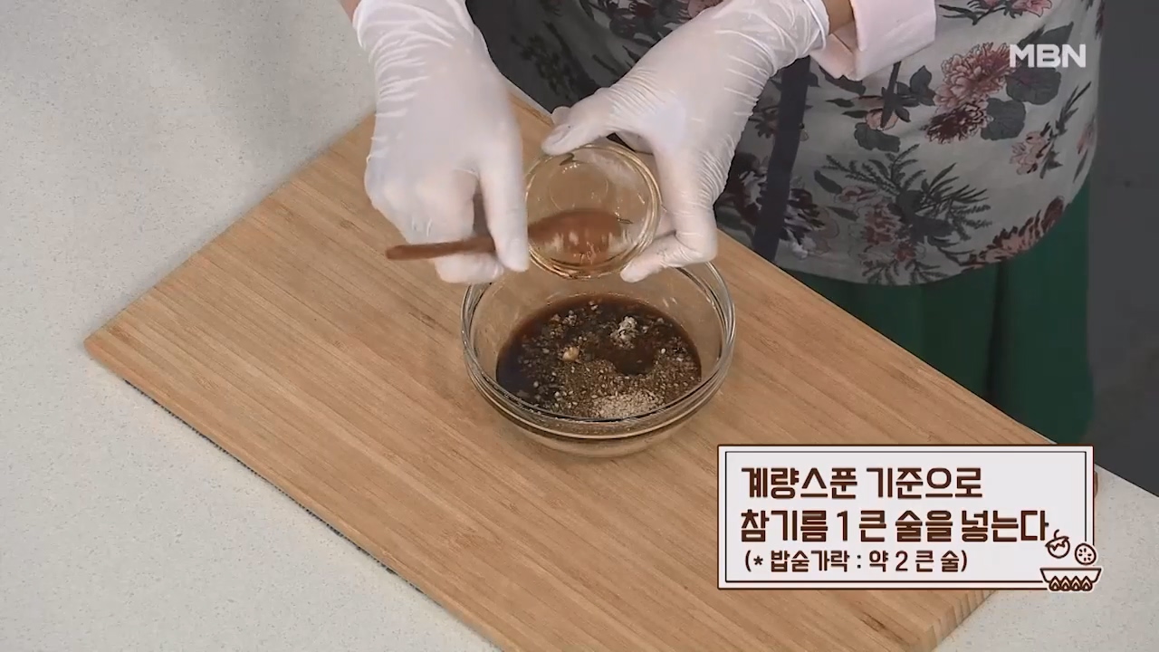 16. 계량스푼 기준으로 참기름 1큰술을 넣습니다. (밥숟가락 약 2큰술)