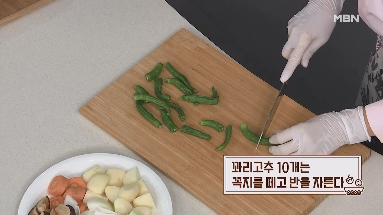 10. 꽈리고추 10개는 꼭지를 떼고 반을 자릅니다.