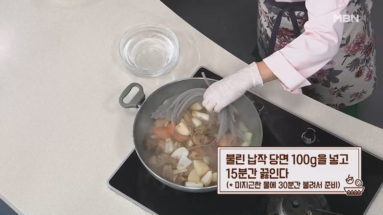 25. 불린 납작 당면 100g을 넣고 15분간 끓입니다. (당면은 미지근한 물에 30분간 불린 당면을 사용합니다.)