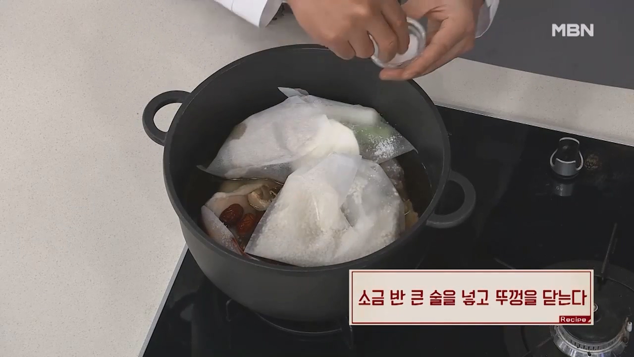 10. 소금 반큰술을 넣고 냄비 뚜껑을 닫습니다.