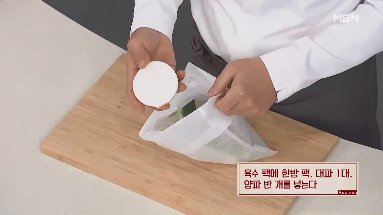 6. 육수팩에 한방 팩, 대파 1대, 양파 반개를 넣습니다.
