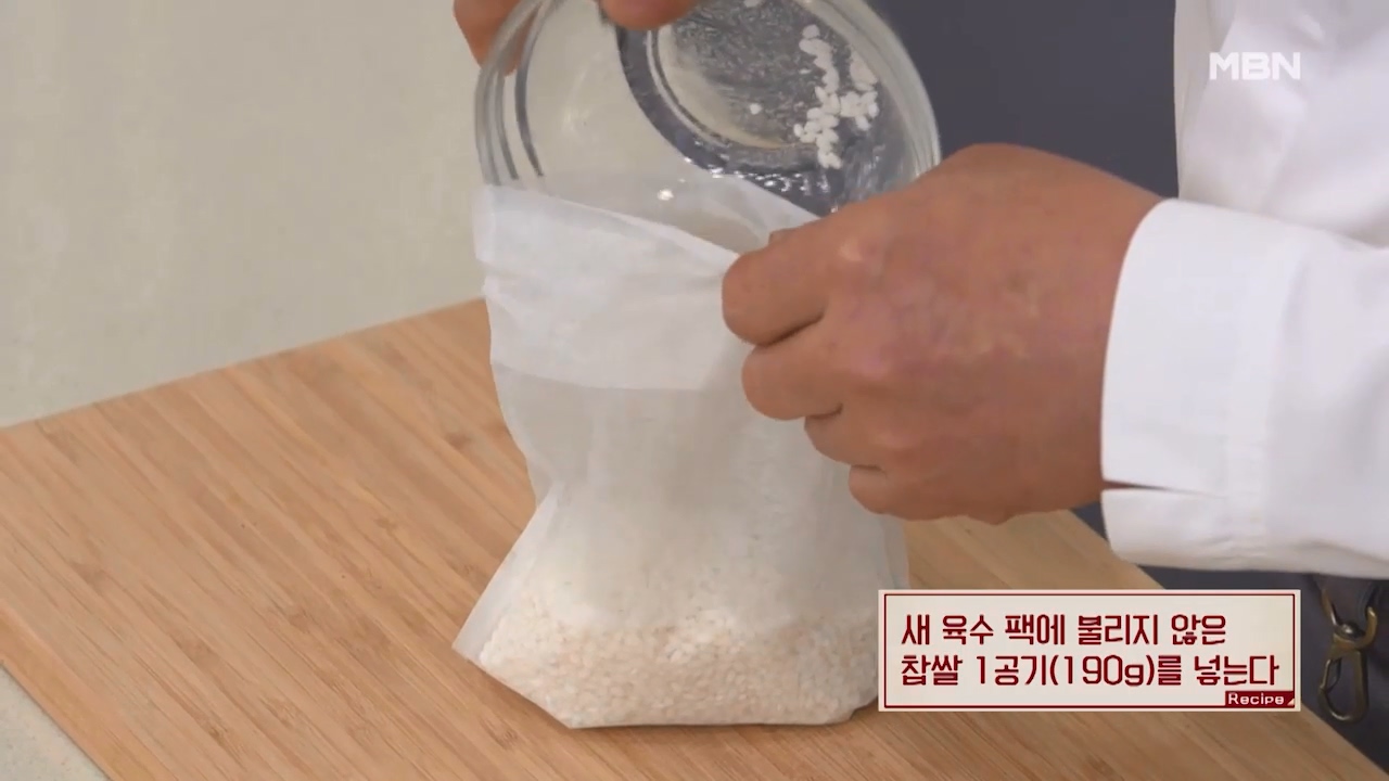 7. 새 육수 팩에 불리지 않은 찹쌀 1공기(190g)를 넣습니다.
