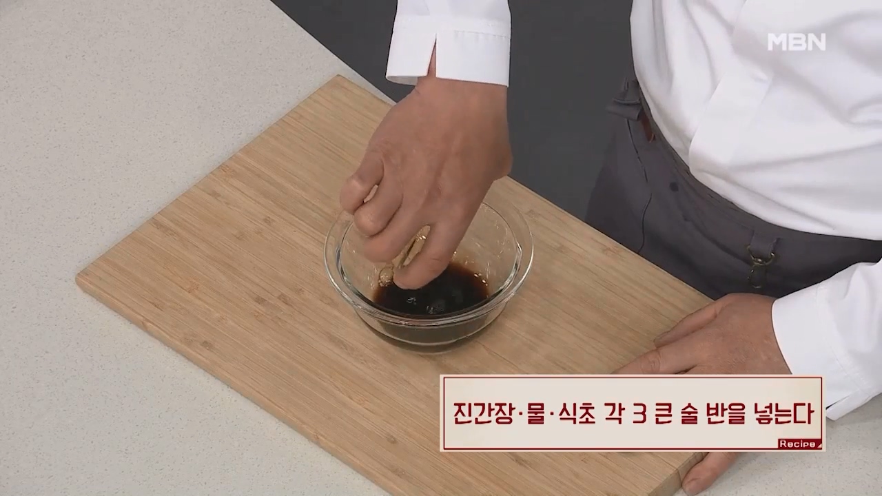 3. 그릇에 진간장 3큰술 반, 물 3큰술 반, 식초 3큰술 반을 넣습니다.