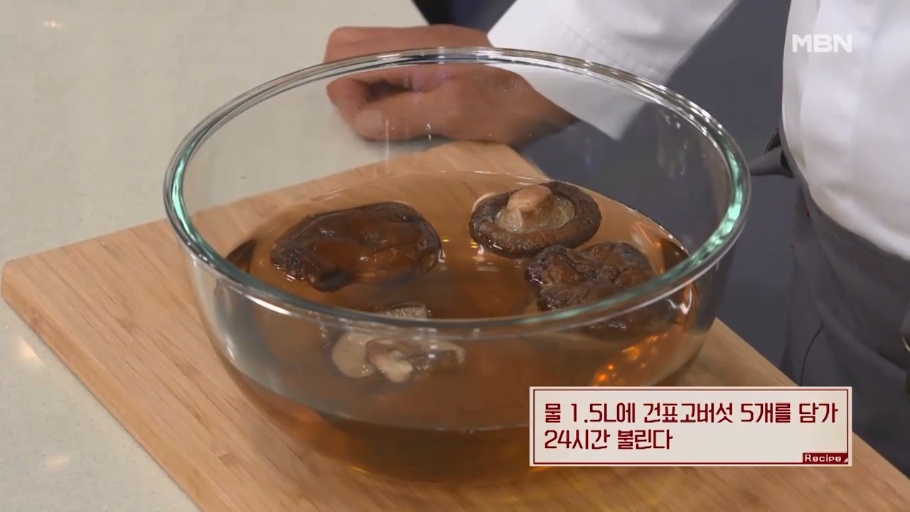 4. 물 1.5리터에 건표고버섯 5개를 담가 24시간 불립니다.