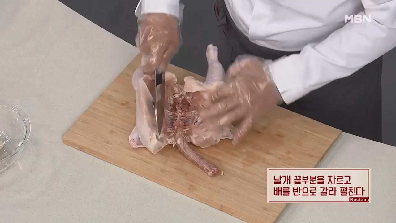 2. 닭 날개 끝 부분을 자르고 배를 반으로 갈라 펼칩니다.
