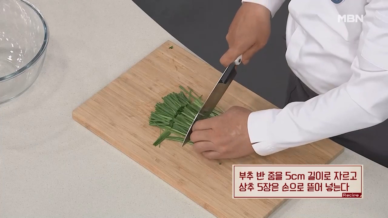 1. 부추 반줌을 5cm 길이로 자르고 상추 5장은 손으로 뜯어 넣습니다.
