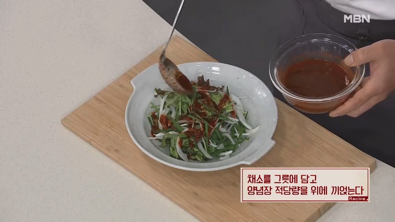 5. 채소를 그릇에 담고 양념장을 적당량을 위에 끼얹으면 부추무침이 완성됩니다.