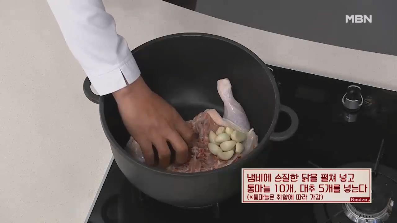 8. 냄비에 손질한 닭을 펼쳐 넣고 통마늘 10개, 대추 5개를 넣습니다. (통마늘은 취향에 따라 가감)